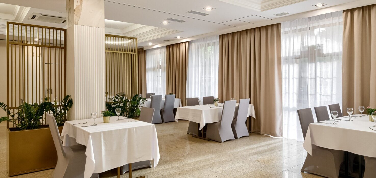 Naszych Gości zapraszamy do trzech sal restauracyjnych, które mogą pomieścić równocześnie 350 osób, zapewniając przy tym kameralny klimat. Restauracja w hotelu to idealne miejsce zarówno na romantyczną kolację przy świecach, jak i uroczyste firmowe przyjęcie. W naszych salach organizujemy również przyjęcia rodzinne: wesela, komunie, chrzciny.